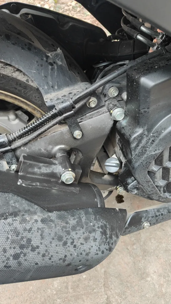 从我家里骑摩托车到徒步起点大概有 70KM 路程,经过两小时的骑行后,终于到达了徒步起点。下车后,一股塑料烧焦的味道引起了我的注意,检查了一圈后,我发现车子的机油盖没拧紧,机油沿途撒了一地。