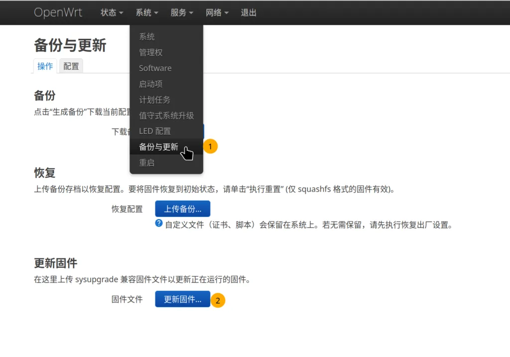 登录 OpenWRT 管理面板后,进入如下页面,并点击「更新固件」。